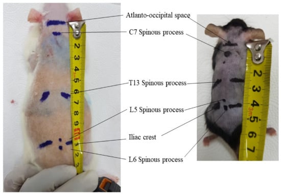 External location of antero-occipital space, C7, T13, L5, L6 spinous process, and iliac crest in 8 weeks old male Sprague Dawley rat and 8 weeks old male C57bl/6 mice. The average distance from antero-occipital space to L6 spinous process is 11 cm in rats and 4.2 cm in mice.