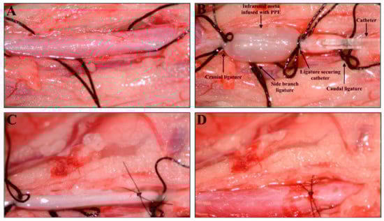 Surgical induction of an abdominal aortic aneurysm with intraluminal infusion of porcine pancreatic elastase (PPE) in a Sprague–Dawley rat. (A) Isolation of the infrarenal aorta before ligation and infusion with PPE. (B) Infrarenal aorta under ligation and intraluminal PPE infusion. (C) Infrarenal aorta after infusion and closure of the incision with an 8.0 suture. (D) Infrarenal aorta with restored blood flow after removal of ligatures.