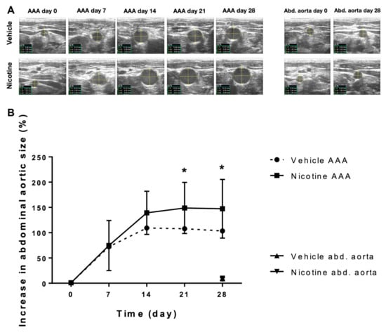 The effect of nicotine treatment on abdominal aortic aneurysm progression. (A) Representative ultrasound measurements of the baseline aortic size at expected aneurysm site prior to surgical aneurysm induction and post-surgery aortic size measurements at day 7, 14, 21 and 28 in the vehicle and nicotine groups. The most proximal part of the infrarenal aorta, just distal from the exit point of the left renal artery, was used as reference for the increase in aortic size during the experimental period of 28 days (Abd. aorta). (B) The relative increase in abdominal aortic aneurysm size measured by ultrasound recordings from day 0–28 in the vehicle group (n = 14) and the nicotine group (n = 13). Values are presented as mean ± standard deviation. * p < 0.05. Abbreviations in ultrasound images: C = circumference; d1 = anterior–posterior diameter; d2 = horizontal diameter; AAA = abdominal aortic aneurysm; Abd. aorta = abdominal aorta.