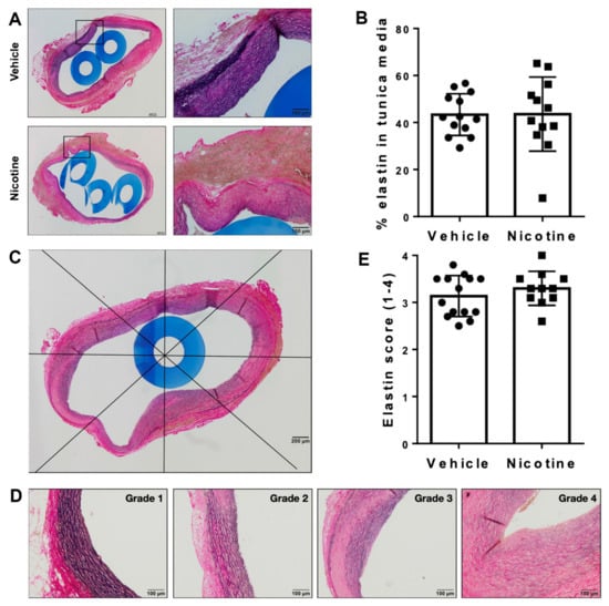 To investigate the aneurysmal elastin structure, we first assessed the percentage of elastin remaining in tunica media after the experimental period of 28 days (Figure 3A,B). No difference in percentage of elastin remaining in tunica media between the groups was found (Figure 3B, p = 0.969). In both groups, we found irregular elastin degradation in the aneurysmal cross-section. Scoring the elastin degradation in 8 areas of the aneurysm cross-sections, we found well-preserved elastin architecture in some areas (grade 1), while other areas contained extensive defragmentation of elastic lamellae with an unidentifiable border zone between tunica media and adventitia (grade 4) (Figure 3C,D). However, there was no significant difference in the score of elastin degradation between the vehicle and nicotine-treated groups (Figure 3E, p = 0.255). Overall, these results suggest that nicotine treatment does not affect elastin integrity.
