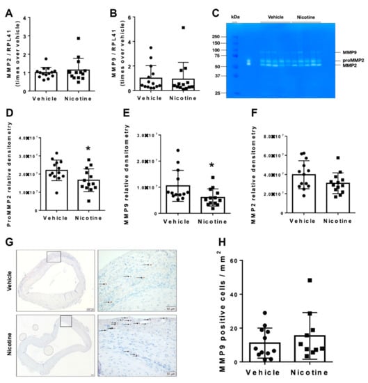 Messenger RNA (mRNA) levels and activity of matrix metalloproteinases (MMPs) in aneurysmal tissue normalized to Ribosomal Protein L41 (RPL41). mRNA levels of (A) MMP2 (n = 14/13) and (B) MMP9 (n = 14/13) in aneurysmal tissue on day 28 in vehicle and nicotine group. (C) Representative image of gelatin zymography to detect MMP activity in abdominal aortic aneurysm in vehicle and nicotine group. The bands showed pro-MMP2 (72 kDa), MMP2 (67 kDa) and MMP9 (78 kDa) activity. The densities of the zymographic bands were quantified by densitometry for (D) MMP2 (n = 13/13), (E) pro-MMP2 (n = 13/13) and (F) MMP9 (n = 13/13). (G) Representative micrographs of MMP9 staining from aneurysmal tissue in vehicle and nicotine groups. Arrows indicate positive cell stains. (H) Number of MMP9-positive cells per mm2 in the two groups. Values are presented as mean ± standard deviation. * p < 0.05.