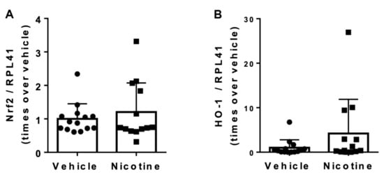 The effect of nicotine on aneurysmal oxidative stress at post-surgery day 28. (A) Messenger RNA (mRNA) levels of nuclear factor erythroid 2-related factor 2 (Nrf2) (n = 14/13) and (B) mRNA levels of heme oxygenase (HO)-1 (n = 14/13) in the aneurysmal tissue normalized to Ribosomal Protein L41 (RPL41). Values are presented as median ± interquartile range.