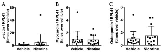The effect of nicotine on smooth muscle cells at post-surgery day 28. Messenger RNA (mRNA) levels of (A) -actin (n = 14/13), (B) myocardin (n = 14/13) and (C) osteopontin (n = 14/13) in the aneurysmal tissue. All data were normalized to Ribosomal Protein L41 (RPL41) mRNA levels. Values are presented as median ± interquartile range.
