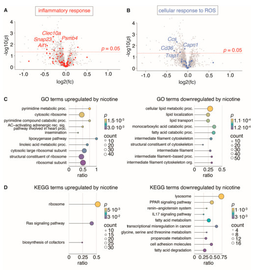 Proteomic analysis of non-aneurysmal aorta segments from rats treated with nicotine (n = 12) and untreated rats (n = 13). (A,B): Volcano plots (nicotine-treated rats relative to untreated rats) showing regulation of all identified proteins, with proteins belonging to gene ontology (GO) terms “inflammatory response” (GO:0006954) and “cellular response to ROS” (GO: 0034614) highlighted in red (A) and blue (B) with the four most significantly regulated proteins labeled. (C,D): Dot plots show the top 10 enriched biological process GO terms (C) and KEGG terms (D) either up- or downregulated by nicotine. Dot size indicates number of proteins found to be regulated by nicotine for a given term and dot color indicates the level of nominally significance. The protein ratio shows the proportion of a given term covered by proteins regulated by nicotine.