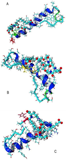 - Lamiable, A.; Thevenet, P.; Rey, J.; Vavrusa, M.; Derreumaux, P.; Tuffery, P. PEP-FOLD3: Faster de novo structure prediction for linear peptides in solution and in complex. Nucl. Acids Res. 2016, 44, W449–W454. [Google Scholar] [CrossRef] [PubMed]