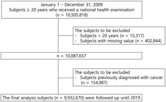 A total of 9,932,670 subjects aged ≥ 20 years with check-ups between January 2009 and December 2009 who had no history of any malignancy or missing data were included. Figure 1 shows the study design. They were followed up until the diagnosis of kidney cancer or death, or until December 2019. This study was conducted according to the Declaration of Helsinki. It was approved by the Institutional Review Board of the Catholic University of Korea (No.SC20ZESI0143). Informed consent was waived because only anonymized and deidentified data were used. This study followed Reporting studies Conducted using Observational Routinely collected health Data (RECORD) guidelines.