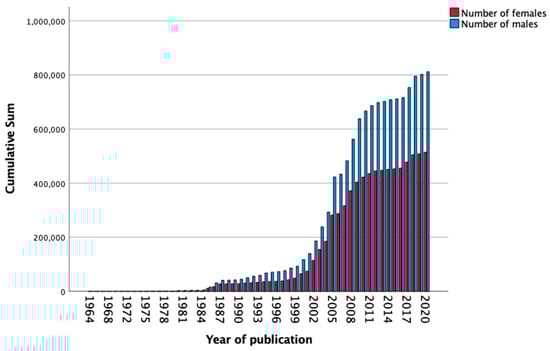 Cumulative sum of the number of females and males (n) participating in included studies over the years from 1964 to 2020.