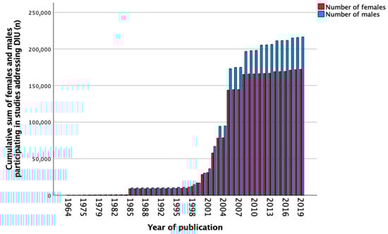 In total, 252 studies reported data on DIU between 1964 and 2019. The number of females and males separately was not mentioned in 13 (5.2%) studies. Sex-stratified outcomes were not shown in two hundred and fourteen (84.9%) studies, female-only cohorts were reported in two (0.8%) studies, and male-only cohorts in thirteen (5.2%) studies. Sex stratification in primary study analysis was performed in ten (4.0%) studies. The total number of participants in all studies was 389,873 adults, of which 44.2% were female and 55.5% male. Figure 3 shows the cumulative sum of included females and males over the years from 1964 to 2019 as seen in Table 4. Between 2011 and 2020, 6177 (25.3%) of the included participants were females, and five (7.5%) studies reported sex-stratified analyses.
