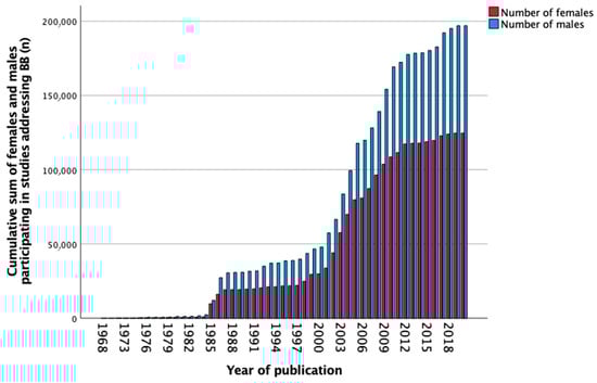 In total, 652 studies reported data on BB between 1968 and 2020. The number of females and males separately was not mentioned in 46 (7.1%) studies. Sex-stratified data was not shown in five hundred and thirty-three (81.7%) studies, female-only cohorts were reported in three (0.5%) studies and male-only cohorts in fifty-one (7.8%) studies. Sex stratification was performed in 19 (2.9%) studies. The total number of participants in all the studies was 340,718, of which 36.6% were females, 57.8% males, and 5.6% had undefined sex. Figure 4 shows the cumulative sum of included females and males over the years from 1968 to 2020. The number of females included in the studies increased slightly over the years as seen in Table 5. Between 2011 and 2020, less than half, 16,061 (36.7%) of included participants were females, and five (5.2%) studies reported sex-stratified data.