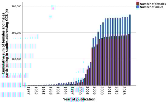 In total, 442 studies reported data on CCB between 1977 and 2020. The number of females and males separately was not mentioned in 28 (6.3%) studies. Sex-stratified data was not shown in three hundred and sixty-eight (83.3%) studies, female-only cohorts were reported in two (0.5%) studies, and male-only cohorts in thirty (6.8%) studies. Sex stratification was performed in 14 (3.2%) studies. The total number of participants in all studies was 464,084, of which 41.9% were females, 57.7% males, and 0.4% were undefined. Figure 5 shows the cumulative sum of included females and males over the years from 1977 to 2020. The number of females included in the studies increased slightly over the years as seen in Table 6. Between 2011 and 2020, almost half, 11,234 (42.8%) of included participants were females, and four (10.3%) studies reported sex-stratified data.
