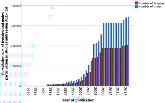 Cumulative sum of the number of females and males (n) participating in studies addressing angiotensin-converting enzyme inhibitors (ACEI) over the years.