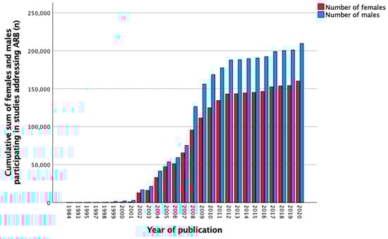 In total, 324 studies reported data on ARB between 1984 to 2020. The number of females and males separately was not mentioned in eight (2.5%) studies. Sex-stratified data was not shown in 295 (91.0%) studies, female-only cohorts were reported in zero (0.0%) studies, and male-only cohorts in seven (2.2%) studies. Sex stratification was performed in 14 (4.3%) studies. The total number of participants in all studies was 379,302, of which 42.2% were females, 55.3% males, and 2.5% were undefined. Figure 7 shows the cumulative sum of included females and males over the years from 1984 to 2020. The number of females included in the studies increased slightly over the years as seen in Table 8. Between 2011 and 2020, almost half, 35,231 (46.2%) of included participants were females, and four (4.8%) studies reported sex-stratified data.