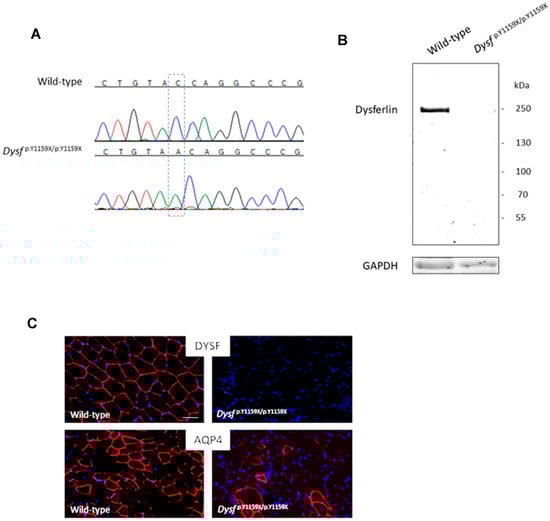 p.Y1159X/p.Y1159X mice muscles confirmed the absence of dysferlin, and remarkably demonstrated a significant decrease in aquaporin 4 (AQP4) labelling (
