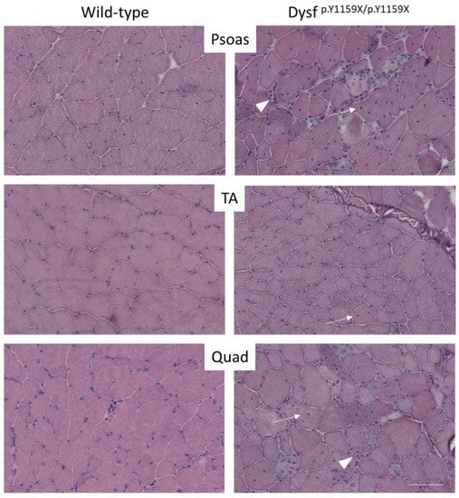 p.Y1159X/p.Y1159X mice caused a similar phenotype including muscle damage, loss of muscle strength, and gait changes in mice. Indeed, as for patients affected with dysferlinopathies, a histological analysis of Dysf