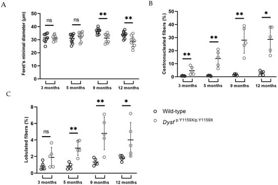 In conclusion, our mouse model Dysf p.Y1159X/p.Y1159X recapitulated most aspects of the phenotype of previous dysferlin-deficient mouse models and dysferlinopathy patients. Dysf p.Y1159X/p.Y1159X mice presented variable muscle fibre sizes, centrally located nuclei, fibrosis, lobulated muscle fibres, a loss of muscle strength, gait abnormalities, and lipid abnormalities. However, it is important to note that Dysf p.Y1159X/p.Y1159X mice had a moderate phenotype since dysferlin absence did not affect overall mobility, reproduction, or the lifespan of mice. This new mouse model can be used to decipher the pathological mechanism of dysferlinopathies, but also, more specifically, to investigate therapeutic strategies such as gene therapy or pharmacological approaches.