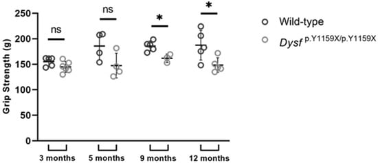 p.Y1159X/p.Y1159X mice at 3, 5, 9, and 12 months. From 9 months of age, a significant decrease in muscle strength was observed in Dysf