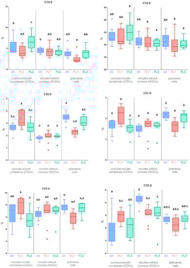Percentages of fatty acids C14:0, C16:0, C20:0, C21:0, C22:0, and C23:0 in COCs, WOCs, and granulosa cells in control (ctrl, blue), FL1 (red), and FL2 (green). Data were taken from our latest publication (Calanni-Pileri et al. Sep. 2022, Supplementary Materials []). GraphPad Prism 5 software (GraphPad Software, San Diego, CA, USA) was used to analyze the data. One-way ANOVA was used for statistical comparison followed by Bonferroni’s posttest. Data are illustrated as the mean ± SEM (standard error of the mean) and designated significant if p < 0.05 (different letters correspond to different levels of significance, e.g., “a” and “b”, or “a,b” and “c” are significantly different, while “a” and “a,b”, or “b” and “a,b” are not.).