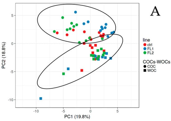(A) Principal component analysis (PCA) and (B) heatmap analysis of the fatty acids profile of WOCs and COCs in control (ctrl), as well as the FL1 and FL2 lines. The heatmap and PCA were created using the free Clustvis web tool (http://biit.cs.ut.ee/clustvis/, accessed on 28 December 2022 []). In the PCA, the ovals around the circles (COCs) and squares (WOCs) were added to better recognize the two sets.