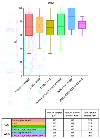We obtained more mature oocytes in the presence of very-long-chain fatty acids (C20:0, C21:0, C22:0, and C23:0) and/or in the presence of C14:0. Those results, even though they were not significantly higher, represent a very good starting point for implementing the IVM method not only in mice but also in farm animals and human fertility care. For an even better demonstration of the “helper” competencies of these fatty acids, we stepped forward with another experiment using control oocytes again, but this time WOCs and COCs were nonsupplemented.