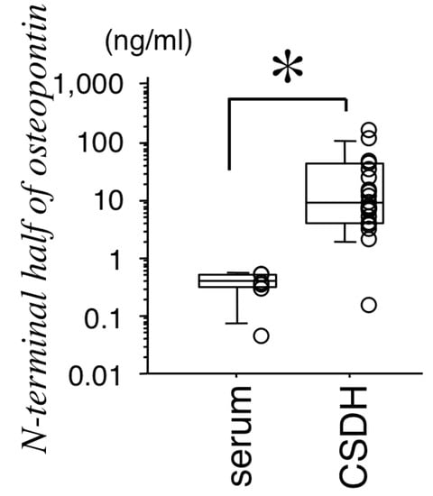 Concentrations of thrombin-cleaved osteopontin (N-terminal half of OPN) in serum (n = 5) and chronic subdural hematoma (CSDH, n = 20). The concentration of the N-terminal half of OPN in CSDH fluid was significantly higher than that in serum based on the Mann–Whitney U test. Data represent the median values and 25th and 75th percentiles with maximum/minimum whiskers with scatter plots. * p < 0.01 according to the Mann–Whitney U test.