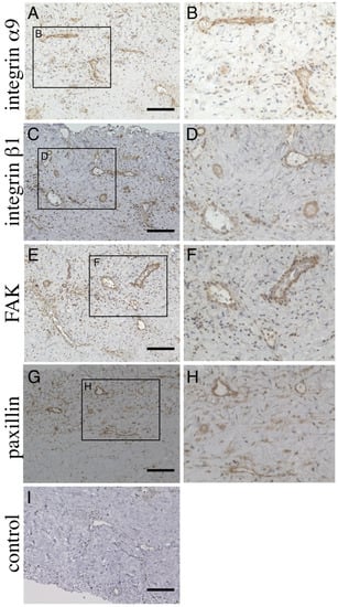 Next, to determine where integrins α9 and β1, FAK and paxillin were expressed in the CSDH outer membrane, we performed an immunohistochemical analysis. The analysis revealed that integrin α9 (Figure 3A,B), integrin β1 (Figure 3C,D), FAK (Figure 3E,F) and paxillin (Figure 3G,H) were localized in the endothelial cells of blood vessels within the outer membrane. Higher magnification images distinctly showed that the endothelial cells expressed these molecules (Figure 3B,D,F,H). The endothelial cells were consistently negative for the markers listed above in the controls without the primary antibodies (Figure 3I). In the adjacent dura mater, there was no apparent staining for these antibodies except for the endothelial cells in tortuous arteries that penetrated the dura mater (Supplemental Figure S1).