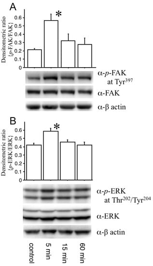 Cultured b.End3 cells were incubated with chronic subdural hematoma fluid for 5, 15 and 60 min. bEnd3 cells treated with media alone were used as the control. Cell lysates were subjected to Western blotting with anti-phosphorylated focal adhesion kinase at Tyr397 (α-p-FAK), anti-FAK (α-FAK), anti-phosphorylated extracellular signal-regulated kinase at Thr202/Tyr204 (α-p-ERK), anti-ERK (α-ERK) and anti-β-actin (α-β-actin) antibodies. The histograms show the amount of p-FAK relative to total FAK and p-ERK relative to total ERK (A,B, respectively). Phosphorylation of FAK and ERK significantly increased in the cultured b.End3 cells compared with the controls 5 min after treatment. The mean ± SE values from the data of 3 series are shown. * p < 0.05 vs. the control (1-way ANOVA followed by Fisher’s PLSD).