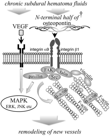 Angiogenesis is a complex process regulated by numerous receptors, growth factors, ECM-cell interactions, etc. The concentration of VEGF in hematoma fluid has been reported to be an essential mechanistic factor in the pathophysiological progression and development of CSDH and angiogenesis [,]. The angiogenic effect of VEGF depends on the presence of integrin β1 []. FAK and Src participate in angiogenesis induced by VEGF [,]. We previously revealed that activation of mitogen-activated protein kinases (MAPKs) by VEGF occurs in CSDH outer membranes and plays a critical role in the angiogenesis of CSDHs [,]. Phosphorylated c-Jun N-terminal kinase (JNK) is expressed in the vascular endothelium of the CSDH outer membrane. FAK activates JNK through an extraordinary mechanism involving the recruitment of paxillin to the plasma membrane []. Overall, this work could serve as a basis for further consideration of the N-terminal half of the OPN/integrin pathway as a potential therapeutic target for CSDH.