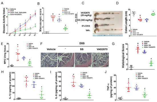 Mice were divided into four groups, and the control group received only drinking water. DSS (mol wt. 36–54 kilodaltons: ICN Biomedicals Inc., Soho, OH, USA) was administered to the mice in the DSS, DSS + VAS2870, and DSS + Sodium salicylate groups via drinking water at 5% w/v for five days. Sodium salicylate (2 mg/kg) or VAS2870 (20 mg/kg) was administered intraperitoneally (i.p.). The records of average DSS consumption were recorded for each cage, daily throughout the experiment. All mice were sacrificed on the fifth day after DSS administration to evaluate the severity of colitis using previously published scoring systems [20]. Disease activity index (DAI) was quantified considering body weight loss, blood in feces, and stool consistency. Macroscopic scoring was performed immediately after the mice were sacrificed based on rectal bleeding, rectal prolapse, diarrhea, and colonic bleeding. Colonic histological damage was scored based on loss architecture, goblet cell depletion, crypt abscess, and inflammatory cell infiltration. Myeloperoxidase (MPO; an index of granulocyte infiltration and inflammation) activity was determined using a published protocol [20].