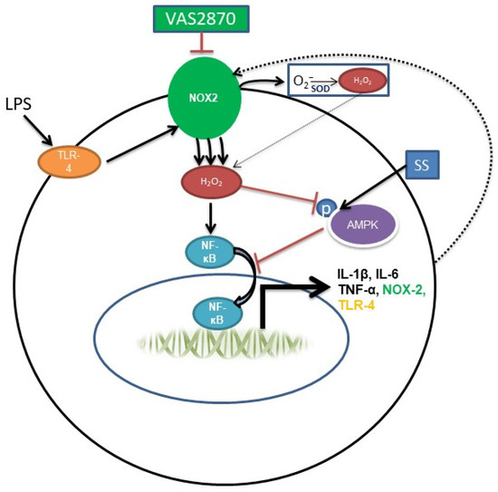 LPS stimulate NOX2 in macrophages by activating TLR4, which enhances ROS production that induces various proinflammatory cytokines, such as IL-1β, IL-6, and TNF-α, along with NOX2 itself (via transcription factors such as NF-κB). AMPK in its active form inhibits the induction of cytokines and NOX-2 to counteract the insults. In a macrophage with dysfunctional AMPK, this balance is disturbed, leading to increased cytokine secretion and prolonged NOX-2 activation as well as the aggravation of inflammatory reaction.