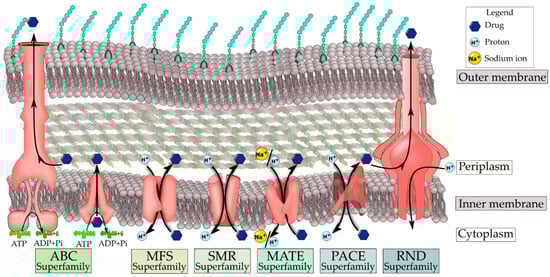 - Andersen, J.L.; He, G.-X.; Kakarla, P.; Kc, R.; Kumar, S.; Lakra, W.S.; Mukherjee, M.M.; Ranaweera, I.; Shrestha, U.; Tran, T.; et al. Multidrug Efflux Pumps from Enterobacteriaceae, Vibrio cholerae and Staphylococcus aureus Bacterial Food Pathogens. Int. J. Environ. Res. Public Health 2015, 12, 1487–1547. [Google Scholar] [CrossRef]