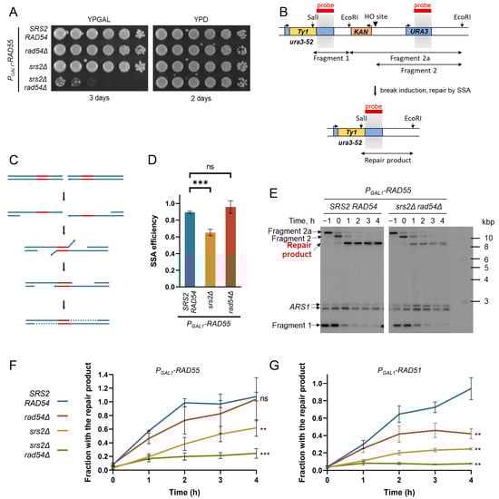 Rad54 and Srs2 are both required for DSB repair by SSA. (A) The conditional srs2Δ and rad54Δ synthetic lethality system. Cells pre-grown on YPRAF (YP + raffinose) were serially diluted (5× step) in YP and frogged on YPGAL (YP + galactose) and YPD (YP + glucose) agar plates. Strains used: NK6933, NK7200, NK7204, and NK7208. (B) SSA system before the induction of a DSB (top) and after its repair by SSA (bottom). Light grey boxes indicate the homologies predominantly used for SSA. As one of the direct repeats (grey boxes) used for the DSB repair and the sequence between the repeats are lost during SSA, the KAN marker in the SSA system allows to distinguish between SSA and Non-Homologous End Joining (NHEJ) repair events: KAN is always lost during the former but rarely during the latter. Double-headed arrows span the DNA fragments formed by the EcoRI + SalI restriction digest as well as the HO cleavage in vivo and monitored by the Southern blotting shown in panel E, using a probe (red boxes) that matches the homologies highlighted in grey. (C) A schematic of the DNA dynamics during SSA. After the initial resection of the DNA around a break, the direct DNA repeats are annealed to each other and non-homologous DNA ends are cleaved off, leaving two ssDNA gaps which are then filled in by DNA polymerases. Direct repeats are shown in red. The DNA synthesis at the post-annealing step is represented by dotted lines. (D) The SSA efficiency in PGAL1-RAD55, PGAL1-RAD55 srs2Δ, and PGAL1-RAD55 rad54Δ mutants determined by plating. Average ± SD of at least three biological repeats is shown for each genotype. Strains used: NK6724-NK6726; NK7291-NK7293; NK7424-NK7428; NK7188-NK7190. (E) Representative images of the Southern blots obtained using the samples collected during the time-course experiments analysed in panels (F,G). Blots were hybridised to two probes. One was specific to the URA3 locus (see panel (B), red boxes) and allowed to monitor the DNA dynamics at the repair site on CHRV, while the other one hybridised to the ARS1 locus on CHRIV and was used for normalisation. (F) Quantitative analysis of the SSA repair product formation over the time course in the PGAL1-RAD55 background using Southern blotting. The average ± SD of at least three biological repeats is shown for each time point of each genotype. Asterisks describe the statistical significance of the difference between the value of the PGAL1-RAD55 control and the value of each mutant derivative at the time point 4 h. Strains used: NK6724-NK6726; NK7188-NK7190; NK7291-NK7293; NK7295-NK7297. (G) Quantitative analysis of the SSA repair product formation over the time course in the PGAL1-RAD51 background using Southern blotting. Same colour-coding was used as in panel (F). The average ± SD of at least three biological repeats is shown for each time point of each genotype. Asterisks describe the statistical significance of the difference between the value of the PGAL1-RAD51 control and the value of each mutant derivative at the time point 4 h. The p values of the two-sample Student’s t-test are presented as follows: ns (p > 0.05), ** (p ≤ 0.01), *** (p ≤ 0.001). Strains used: NK5858-NK5860; NK5861-NK5863; NK5864-NK5866; NK5868-NK5870.
