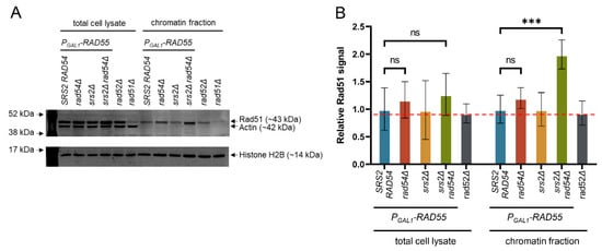 As demonstrated above, the Srs2- and Rad54-mediated regulation of Rad51 nucleoprotein filaments is required for DNA synthesis during DSB repair. It has been previously estimated that S. cerevisiae cells suffer only 0.12 spontaneous DSBs per cell cycle [,,]. Although DSBs might not be frequent enough to be the sole reason for the srs2Δ and rad54Δ synthetic lethality, unregulated Rad51 nucleoprotein filaments might accumulate on chromatin containing other lesions, for example, paused and stalled replication forks, causing cell death in the absence of Srs2 and Rad54. A set of PGAL1-RAD55 strains similar to the ones described above (Figure 1), but without the SSA system, was used to test if srs2Δ rad54Δ cells accumulated persistent Rad51 nucleoprotein filaments. To this end, the strains were pre-grown to the early log phase in raffinose-containing media, synchronised in G1 using α-factor, subjected to the PGAL1 induction for one hour, and then released into fresh galactose-containing media with nocodazole. Two hours after the release from the α-factor arrest, proteins were crosslinked to DNA by adding formaldehyde to the cultures. Cell samples were collected to quantify the Rad51 abundance in the chromatin fraction in comparison to the total cell protein (Figure 2). Because Rad52 is required for Rad51 filament formation, rad52Δ cells were used as a control for estimating the non-specific presence of Rad51 in the chromatin fraction (Figure 2). While no statistically significant differences were observed in the total cellular Rad51 levels among all the strains, the PGAL1-RAD55 srs2Δ rad54Δ cells exhibited an increase in the relative amount of Rad51 present in their chromatin fraction after a single round of genome duplication (Figure 2B). At the same time, all the other strains had Rad51 in their chromatin at levels comparable to the one in the rad52Δ cells, i.e., at the level of non-specific DNA binding. This suggests that in the presence of either Rad54 or Srs2, very little or no Rad51 filaments accumulate on DNA. When neither Rad54 nor Srs2 is present, the level of Rad51 in the chromatin fraction increases and the accumulation of the nucleoprotein filaments becomes detectable.
