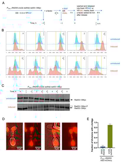 As indicated by the sub-G1 peak in the FACS analysis after the induction of the RAD55 expression (Figure 3B), the PGAL1-RAD55 srs2Δ rad54Δ cells appeared to suffer significant amounts of genomic instability when transitioning from the first cell cycle to the following G1. This might be caused by abundant aberrant mitoses. To investigate this possibility, the nuclear dynamics in the PGAL1-RAD55 srs2Δ rad54Δ cells was followed using live-cell imaging. The histone H2B was tagged with the mCherry fluorescent protein, and the resulting strains were pre-grown in raffinose-containing media to the early log phase, synchronised at G1 using α-factor, and subjected to the PGAL1 induction for one hour. Cells were then released from the α-factor arrest, placed on YPGAL agar pads, and imaged at 30 °C to observe the first cell division. As expected from the FACS experiments, the PGAL1-RAD55 srs2Δ rad54Δ cells arrested in G2. Interestingly, the post-arrest mitoses in the vast majority of the srs2Δ rad54Δ mutant cells were accompanied by mitotic bridges which were rarely observed in the control SRS2 RAD54 cells (Figure 3D,E).