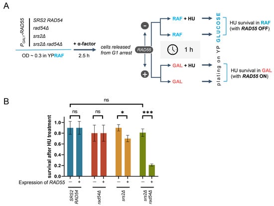 Mitotic bridges can be caused by unresolved HR intermediates prompted by a number of DNA lesions []. However, this was unlikely to be the case in the PGAL1-RAD55 srs2Δ rad54Δ mutants as Rad54 would be required to generate such HR intermediates [,]. Mitotic bridges could also be formed as a result of DNA under-replication or aberrant termination of DNA replication, both of which are symptomatic of the problems at replication forks [,,,]. Thus, the ability of the cells to recover from replication stress was investigated in the mutants lacking Srs2 and/or Rad54, in the absence and presence of Rad51 nucleoprotein filaments (Figure 4A). PGAL1-RAD55 cells with srs2Δ and/or rad54Δ were pre-grown in the presence of raffinose to the early log phase, synchronised in G1 using α-factor, and then released into either raffinose- or galactose-containing media with or without 200 mM hydroxyurea (HU). After a one-hour incubation, cells from each culture were diluted and plated on glucose-containing media, thereby shutting off the RAD55 expression and effectively diluting the HU away. The scored colonies were then used to calculate the survival of the HU treatment in YPRAF and YPGAL, and by comparing those to evaluate the effect of the Rad51 filament formation (through the RAD55 expression in YPGAL) on the survival of the HU-generated replication stress in a particular genetic background (Figure 4A,B).