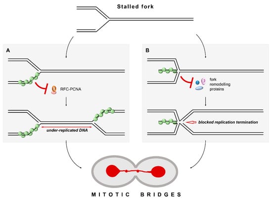 Compared to our first model, the second one would require a lower frequency of replication fork stalling to cause aberrant mitoses as the junctions between the sister chromatids could be prompted by a single replication fork stalled at naturally occurring replication barriers such as those found in rDNA, tRNA genes, and telomeres []. However, in both models, the ensuing unresolved physical links between sister chromatids could lead to the formation of mitotic bridges and chromosome breakage.
