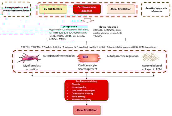 Adverse cardiac remodeling in AF patients includes AF-related atrial remodeling and cardiac remodeling due to concomitant CV diseases [50]. Both variants may be associated with sinus node dysfunction, variability in conduction gaps due to parasympathetic/sympathetic stimulation and epigenetic regulation of intercellular communication, cardiac cell-to-cell heterogeneity, and extracellular matrix alteration [50,51,52,53]. Therefore, the overlap between both variants of remodeling is mediated by concomitant hemodynamic changes such as valvular regurgitation [54]. AF-related alteration of atrial structure starts with the differentiation of cardiac fibroblasts into myofibroblasts, which is regulated by numerous triggers, including angiotensin-II, noradrenaline, thyroid hormones, inflammatory cytokines, chemokines, matrix metalloproteinases, galectine-3, soluble suppression of tumorigenesis-2 (sST2), TGF-beta-1 and microRNAs (Figure 2).