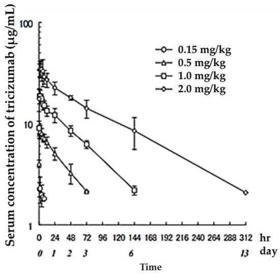 Serum concentrations of Tocilizumab in healthy adults after a single administration quoted from reference [13].