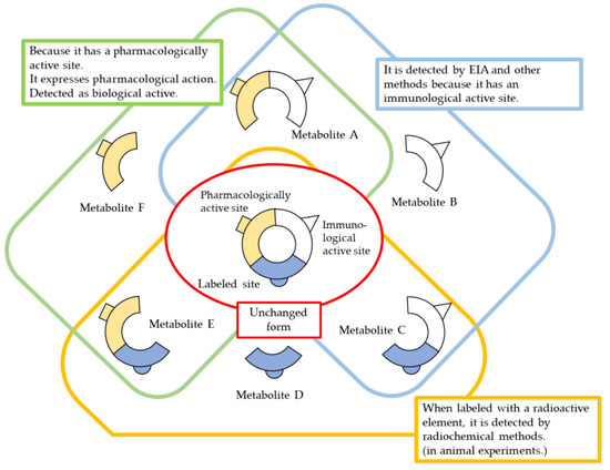 ELISA is the most commonly used immunological method for measuring blood levels, followed by RIA. However, in this case, immune activity does not always reflect only unchanged metabolites, and it is possible that some metabolites retain immune activity but lose biological activity, or vice versa. It cannot be ruled out that some metabolites may enhance immune activity or biological activity. Therefore, it is desirable to investigate the correlation between immune activity, biological (pharmacological) activity, and unchanged drug amount (concentration) at least in an in vitro test system. On the other hand, if sensitivity and accuracy are sufficient, biological (pharmacological) activity can be taken as an indicator of drug concentration. In such a case, the activity does not necessarily reflect the concentration of the unchanged drug itself, but if the biological activity, including metabolites, is considered important, it is worth considering this activity in regard to the apparent unchanged drug amount (Figure 3).
