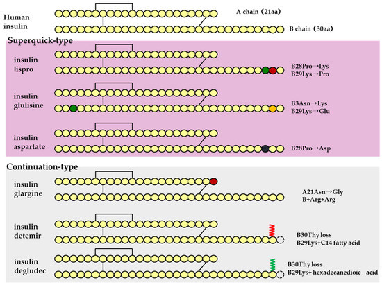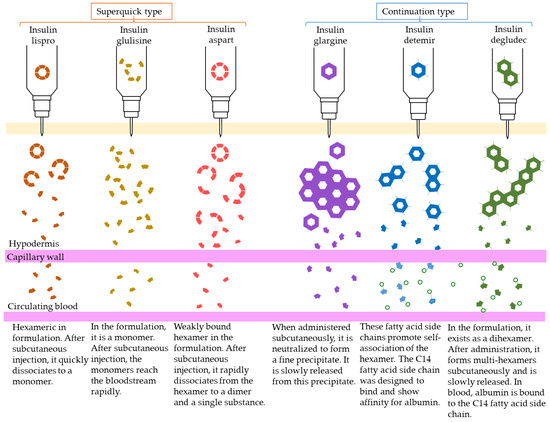Human insulin has a short duration of action and must be injected subcutaneously before each meal. However, because it can be sustained by forming crystals with protamine, once-daily protamine preparations or mixtures of these preparations and insulin are now on the market. These human insulin preparations do not take effect until approximately 30 min after administration. Therefore, patients need to administer insulin 30 min before a meal, but there is a risk of hypoglycemia if patients do not eat 30 min after receiving insulin. To avoid this, recombinant, ultra-fast-acting insulin analogs have been developed by modifying some of the amino acids in insulin. The insulin monomer consists of an A chain with 21 amino acids and a B chain with 30 amino acids. In the formulation, it forms a hexamer, which dissociates into a monomer in the subcutaneous tissue and enters the blood vessels where it exerts its effects. Insulin lispro [15] has a structure in which proline and lysine at positions 28 and 29 of the human insulin B chain are replaced. Although it exists as a hexamer in the formulation, it dissociates quickly into a monomer after subcutaneous injection, resulting in rapid transfer from the subcutaneous region into the bloodstream. Insulin glulisine [16,17] has asparagine at position 3 of the B chain replaced with lysine, and lysine at position 29 of the B chain replaced with glutamic acid. These substitutions make insulin glulisine more stable as a monomer and inhibit the aggregation of monomeric to dimeric and the dimeric to hexamic forms of insulin glulisine. In insulin aspart [18,19], proline at position 28 of the B chain is replaced with aspartic acid. In the formulation, the hexamer is weakly bound by zinc ion or phenol, but after subcutaneous injection, the hexamer is rapidly dissociated into dimers and monomers by dilution with body fluid and rapidly transferred into the bloodstream. Since these recombinant forms can also be sustained by forming crystals with protamine, a “mixed (intermediate) type” of the recombinant alone and a protamine preparation has been developed (Figure 4 and Figure 5, Table 4).