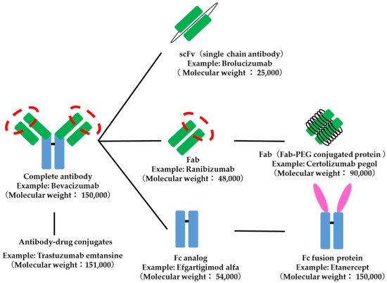Antibody-related drugs are structurally classified into IgG-type drugs that combine targeting to specific tissues and in vivo stability, Fab analogs and ScFv (single-chain antibodies) that are designed for kinetic targeting to specific tissues, and Fc analogs that are designed for stability in the body. Fab-PEG complex proteins with improved in vivo stability of Fab analogs and Fc fusion proteins with targeting and pharmacological functions added to Fc analogs are also subdivided. Antibody–drug conjugates, in which a drug is conjugated to a monoclonal antibody, are also included in antibody-related drugs (Figure 6).