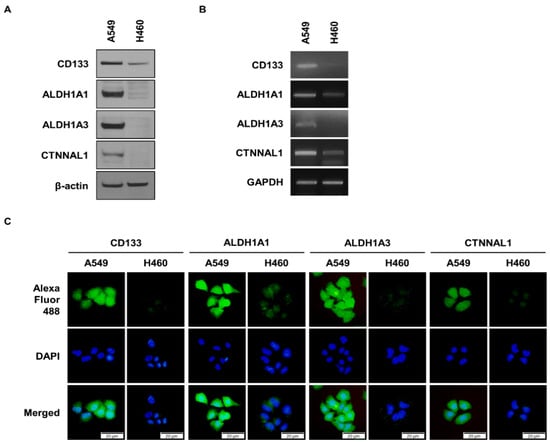 Comparative analysis of CSC marker proteins and CTNNAL1 expression in A549 and H460. (A) Comparison of protein expression levels of CSC marker proteins and CTNNAL1 between A549 and H460 cells. β-actin was used as a loading control. (B) Comparison of gene expression levels of CSC markers and CTNNAL1 between A549 cells and H460 cells. GAPDH was used as a loading control. (C) Comparison of protein expression levels of CSC marker proteins and CTNNAL1 using the ICC assay.
