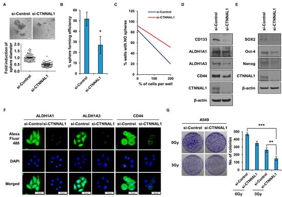 Investigation of the role of CTNNAL1 in cancer stem cell properties and radio resistance. (A) A549 cells were treated with si-CTNNAL1 and then exposed to a spheroidization assay using CM. (B) A549 cells were treated with si-CTNNAL1 and then subjected to a single-cell assay using a 96-well plate. Each well was seeded with a single cell and then cultured. (C) A549 cells were transfected with siRNA to suppress the expression of CTNNAL1 and then subjected to a limiting-dilution assay. Experiments were performed with 1, 50, 100, 150, and 200 cells in each well. (D) Expression of CSC marker proteins CD133, ALDH1A1, ALDH1A3, and CD44 after inhibition of CTNNAL1 using siRNA. (E) Comparison of the expression of CSC regulatory proteins SOX2, Oct-4, and Nanog after using si-CTNNAL1. (F) ICC analysis after knockdown of CTNNAL1 with siRNA to compare the expression of CSC marker proteins. (G) A colony-formation assay was performed to determine the ability to resist irradiation. The irradiation dose was 3 Gy, and the expression of CTNNAL1 was suppressed using siRNA before irradiation. After 10 days of culture, colonies were stained with crystal violet. Error bars represent mean ± SD of triplicate samples. * p < 0.05, ** p < 0.01, *** p < 0.0001 versus control. Scale bar = 50 μm.
