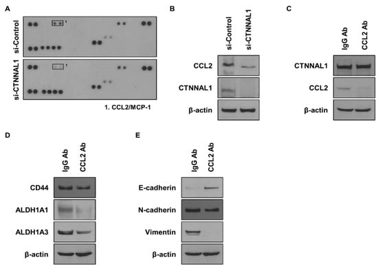 Cancer cells are known to rely on cytokines to drive malignancy and regulate the behavior of immune cells. Therefore, we performed a cytokine array to identify cytokines regulated by CTNNAL1 (Figure 4A). The results showed that CCL2 was significantly reduced in cell lines treated with si-CTNNAL1. To determine if CTNNAL1 regulates CCL2, we performed WB (Figure 4B). In cells where CTNNAL1 was reduced by siRNA, CCL2 was reduced. To determine whether there is a mutual regulation between CTNNAL1 and CCL2, WB was performed after treatment with a CCL2 neutralizing antibody (Figure 4C). Inhibiting CCL2 signaling did not change the protein expression of CTNNAL1; however, the expression of CCL2 was reduced by the CCL2 neutralizing antibody. To determine whether secreted CCL2 affects CSCs, we checked the CSC marker proteins CD44, ALDH1A1, and ALDH1A3 (Figure 4D). The results showed that the expression of all marker proteins was reduced. Furthermore, we observed EMT marker proteins after treatment with CCL2 neutralizing antibodies and found that E-cadherin was increased by CCL2, while N-cadherin and Vimentin were decreased (Figure 4E).