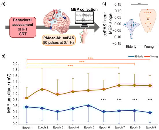 (a) Experimental design. Behavioral assessment was followed by the administration of a ccPAS protocol over the left PMv and M1. For each paired PMv-M1 stimulation of the ccPAS protocol, an MEP was collected from the right FDI; (b) mean MEP amplitudes recorded during the ccPAS in elderly (blue) and young (orange) participants along 9 epochs; (c) linear slope of MEP increase during ccPAS in the two groups. Error bars represent standard deviations; *** p ≤ 0.001.