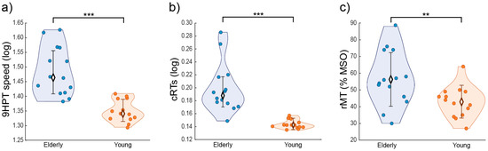 (a) 9HPT performance; (b) cRTs; and (c) rMT in young (orange) and elderly (blue) individuals. Error bars represent standard deviations; ** p ≤ 0.01; *** p ≤ 0.001.