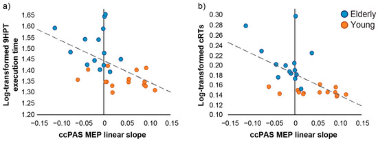 A decrease in manual dexterity is commonly observed in older adults and, although this can be partially ascribed to peripheral changes affecting muscles or nerves, evidence of reduced white matter volume and density in the elderly sensorimotor system [3,5,6] hints at the contribution of impaired cortico-cortical connectivity to age-related reductions in motor control efficiency [15,16,17,18]. Hence, in this study, we hypothesized that age-related differences in fine manual control might reflect the efficiency of the PMv-M1 network, which is crucial for transforming sensory stimuli into appropriate motor commands during manual performance [46,79,80]. As a neurophysiological index of PMv-M1 network efficiency, we evaluated the linear increase of corticomotor excitability during PMv-M1 ccPAS administration, i.e., the ccPAS MEP linear slope, which reflects the plasticity of the targeted network. We tested whether this neurophysiological index would predict age-related individual differences in fine manual control. We assessed motor performance at baseline, before any ccPAS intervention, using two established motor tasks, namely the 9HPT and cRT, which are used to evaluate hand motor dexterity and visuomotor speed and have been associated with activation of premotor–motor areas [6,58,81,82,83]. As reported previously [49], these results confirm prior findings of decreased manual motor performance in the elderly, with slower 9HPT and cRT performance [8,84]. Moreover, while young adults show sensitivity to ccPAS administration, improving their performance after it, elderly participants present no modulation at a group level, suggesting that, on average, advanced age impairs the susceptibility to plastic changes in the PMv-M1 network [28,29,30].