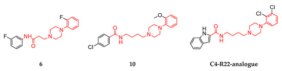 - Perrone, R.; Berardi, F.; Colabufo, N.A.; Leopoldo, M.; Tortorella, V. A structure-affinity relationship study on derivatives of N-[2-[4-(4-Chlorophenyl)piperazin-1-yl]ethyl]-3-methoxybenzamide, a high-affinity and selective D(4) receptor ligand. J. Med. Chem. 2000, 43, 270–277. [Google Scholar] [CrossRef]