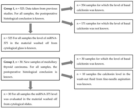 A total of 555 patients were enrolled in the study. The data on 525 patients (group 1 of patients) were taken from our previous studies performed to evaluate the diagnostic accuracy of the Thyroid-INFO test [,,]. In this group, in previous studies, the expression level of miRNA-375 was determined for all the samples, and, for some samples (n = 354), the basal calcitonin level was known. In these studies, the criteria for inclusion in the study were as follows: patients’ age being at least 18 years, the presence of primary cytological slides with a sufficient amount of cellular material (Bethesda category II–VI), and postoperative histological conclusion being known. Expression of miRNA-375 was determined in the material washed off from cytological slides (Figure 1). The distribution of pathologies was as follows: goiters, 79 (15%) cases; follicular adenoma (FA), 219 (41.2%); oncocytic adenoma (OA), 60 (11.4%); follicular thyroid carcinoma (FTC), 30 (5.7%); oncocytic thyroid carcinoma (OTC), 13 (2.4%); papillary thyroid carcinoma (PTC), 108 (20.6%); medullary thyroid carcinoma (MTC), 11 (2.1%); and parathyroid adenoma (PTA), 5 (0.9%) cases. The proportion of malignant tumors was 30.8%. There were 83 men (15.8% of cases), mean age 53 (18–83) years; and 442 women (84.2%), mean age 55 (18–86) years.