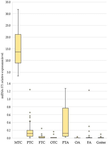 In patients with MTC, the miRNA-375 level differed statistically significantly from those for all other types of tumors (p = 0.000001). Although its expression level was also increased in patients with PTC and PTA, the range of variation was significantly higher in the case of MTC. The ratio between the mean miRNA-375 level in patients with MTC and PTC was 76.4.