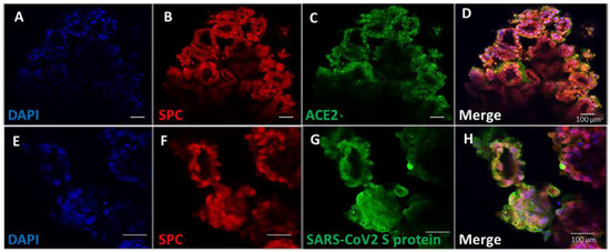 To demonstrate the physiological relevance of the iPSC pulmonary organoids, their interaction with SARS-CoV-2 was investigated. It is known that the spike protein of SARS-CoV-2 binds the host angiotensin-converting enzyme 2 (ACE2) for viral entry into the host cells [26]. We demonstrated that ACE2 proteins were present in SPC-positive cells in the pulmonary organoids (Figure 4A–D). To determine the virus binding capability, recombinant SARS-CoV-2 spike proteins were incubated with the organoids and visualised by immunofluorescent microscopy. Results showed that there was clear detection of membrane-bound SARS-CoV-2 spike proteins on alveolar cells of the organoids (Figure 4G), and the staining was also co-localised to cells expressing SPC (Figure 4E–H).